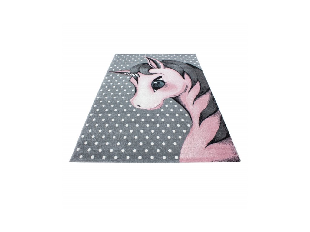 Měkký a hřejivý koberec Kids do dětských pokojů se vzorem růžového jednorožce na šedém pozadí vnese do interiéru pohádkovou atmosféru.