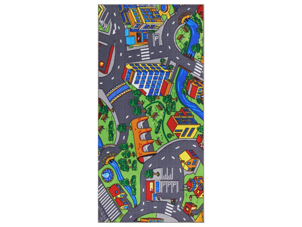 Dětský kusový koberec se vzorem města.