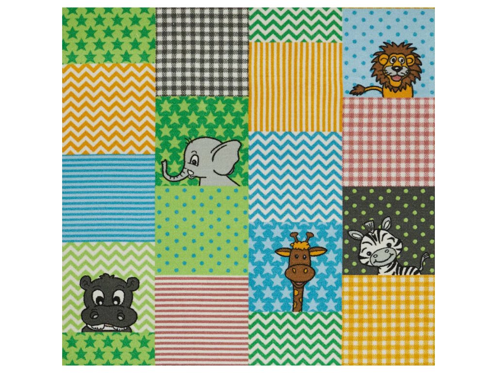 Tento metrážní koberec s dětským vzorem je dokonalým doplňkem do každého dětského pokoje či herního koutku. Jeho hravý design sestává z pestrobarevných čtverců se vzory hvězdiček, proužků a kostek, přičemž každý kousek zdobí veselá zvířátka, která rozzáří místnost a podnítí dětskou fantazii. Koberec je vyroben z polyamidových vláken, která jsou známá svou vysokou odolností a snadnou údržbou. Uzlíková struktura dodává koberci trvanlivost a zároveň zajišťuje komfort při chůzi. Spodní strana je opatřena filcovým podkladem, díky kterému koberec dobře přilne k podlaze a poskytuje izolační vlastnosti, čímž pomáhá udržovat teplo v místnosti. Tento koberec je ideální do dětských pokojů, školek, heren či čtenářských koutků. Děti si na něm mohou pohodlně hrát, sedět či ležet a zároveň si užívat hravého motivu zvířátek. Dopřejte svým dětem pohodlný a veselý prostor pro hraní s tímto kvalitním dětským kobercem!