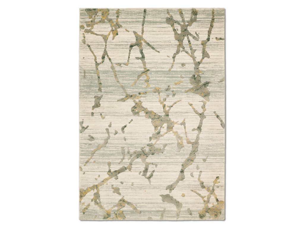 Abstraktní, kusový koberec v zelených barevných odstínech.