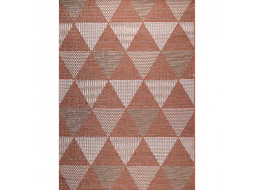Koberec Flat ve stříbrno-korálovém provedení s trojúhelníkovým geometrickým vzorem. Koberec nemá vlas, což jej činí ideálním i pod nábytek.
