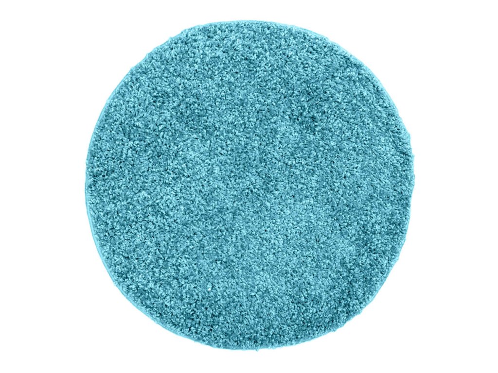 Tyrkysový shaggy koberec s vyšším vlasem ve tvaru kruhu.