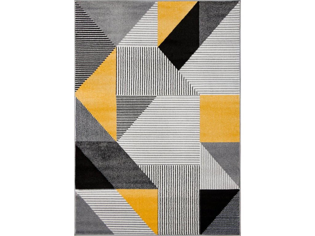 Kusový koberec s geometrickým vzorem v šedo-žluté barvě.