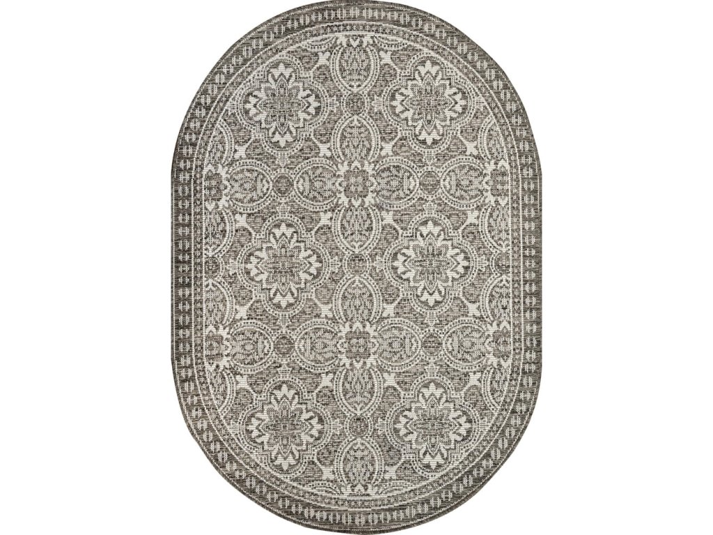 Koberec Flat tmavě šedé barvy s ornamentálním květinovým vzorem. Koberec se řadí mezi bukláky neboli tkané koberce bez vlasu, snadno se udržuje a je odolnější proti otlačení. Koberec má oválný tvar.