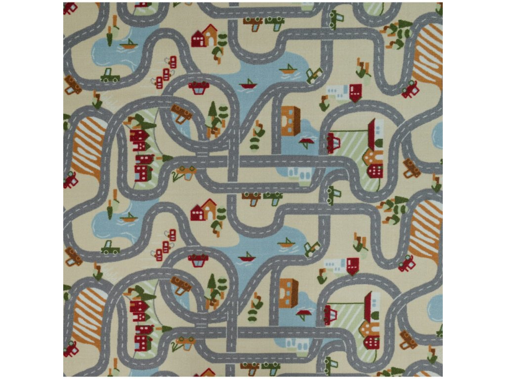 Měřený, dětský koberec se vzorem cestiček v béžové barvě. Koberec je vyroben z polyamidového vlákna, má uzlíkovou strukturu a zateplený, filcový podklad.
