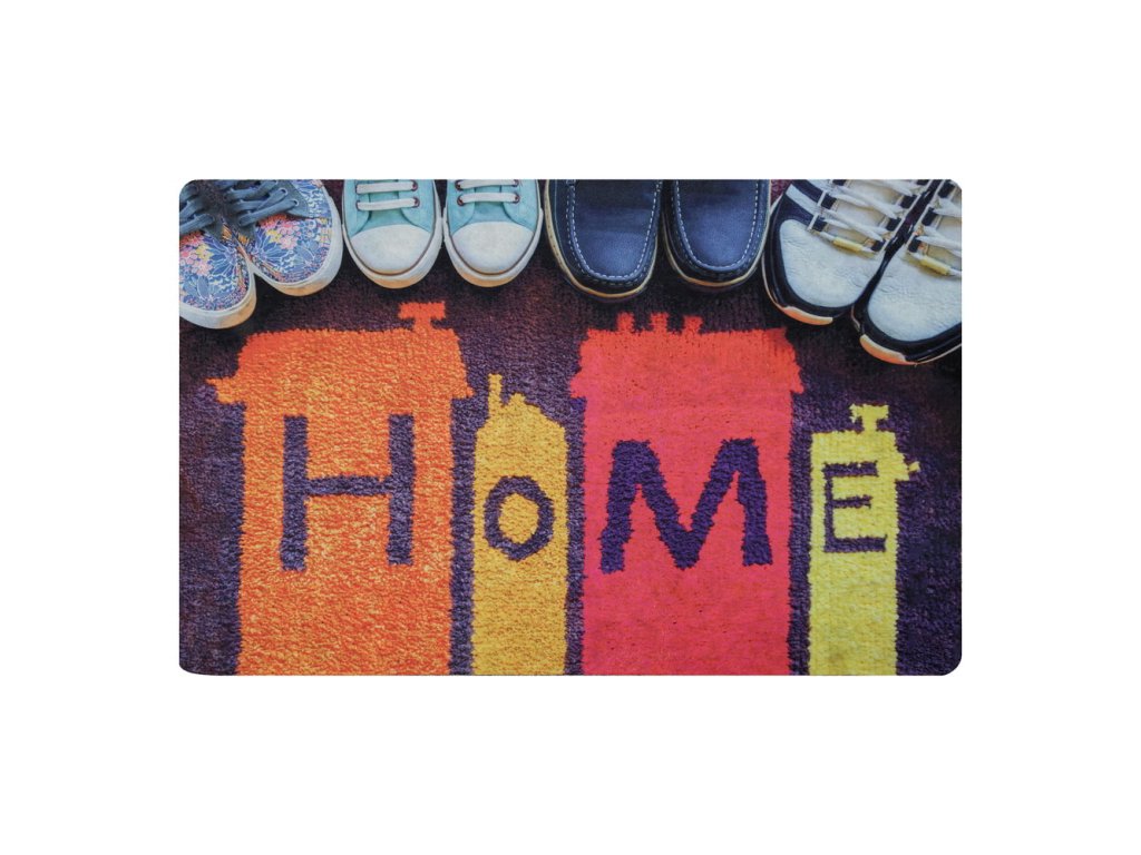 Vstupní rohožka z pvc s potištěným vzorem s botami a nápisem HOME.