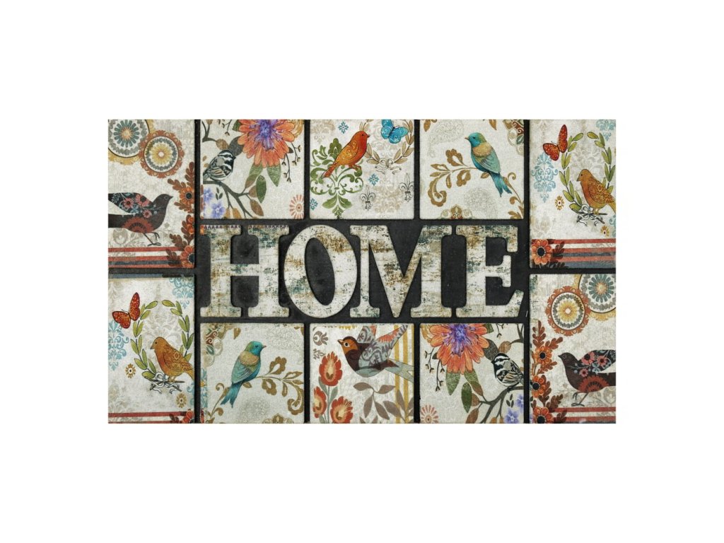 Barevná rohož s květinami, ptáčky a nápisem Home