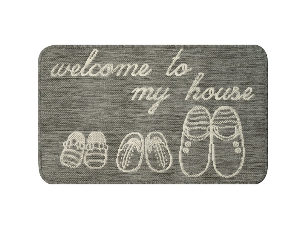 Rohož Leon se vzorem bot a vítacím nápisem v šedé barvě je vyrobena z polypropylenové příze ve šňůrkovém provedení díky čemuž je praktická a nenáročná na údržbu. Rohož je vhodnější pro použití v interiéru, ale můžete ji dát také před dveře v chodbách bytových domů.
