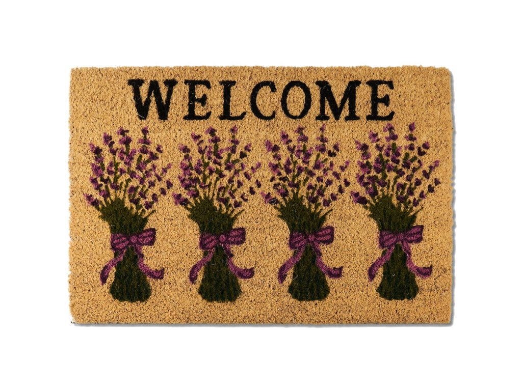 Rohož z přírodního materiálu se vzorem levandule as nápisem.