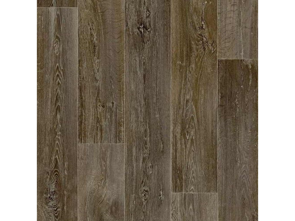 Metrážový vinyl s tmavě hnědým dřevěným vzorem.